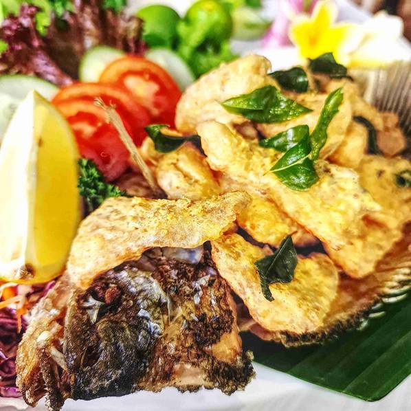 Gurame Endhog Asin Gouramy fillet sauteed with Salted egg yolk sauce (Sharing menu) | Rp 289.000 Available - +